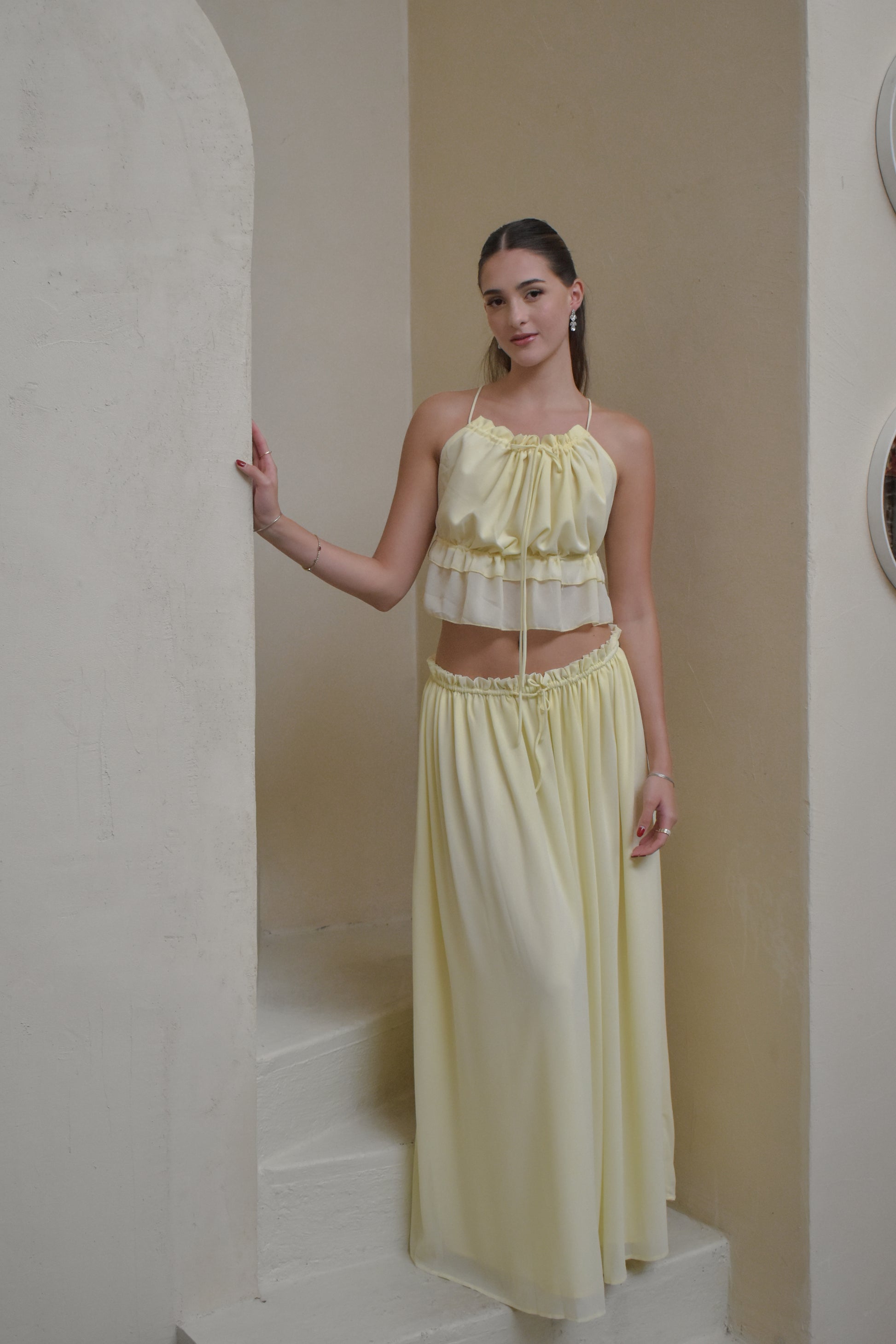 Set de falda larga y top con espalda abierta.